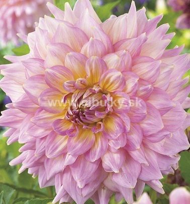 Dália Strawberry Ice je dekoratívna georgína známa svojimi veľkými, nápadnými kvetmi v jemných odtieňoch ružovej, krémovej a svetlo žltej.