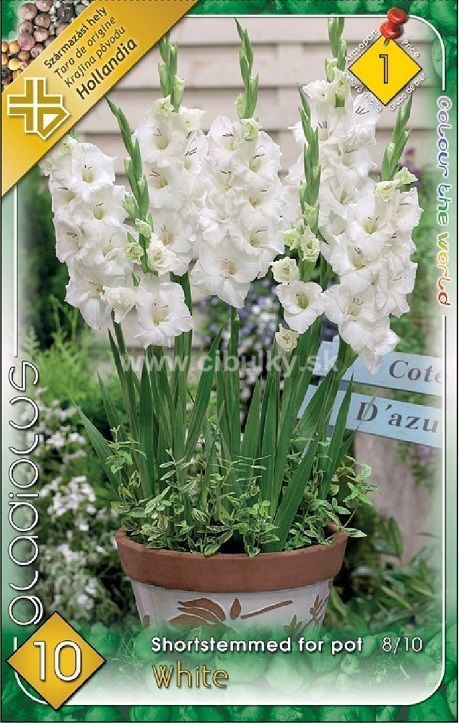 Biela odroda gladiolu s kratšími stonkami, ale kvetmi v plnej veľkosti vhodná na pestovanie v nádobách.