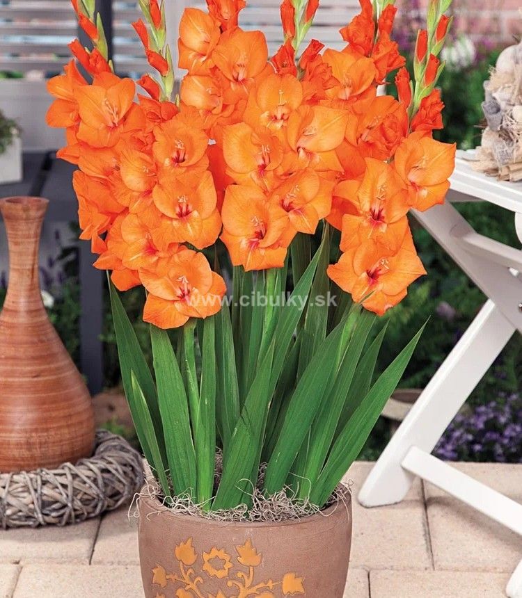 Oranžová odroda gladiolu s kratšími stonkami, ale kvetmi v plnej veľkosti vhodná na pestovanie v nádobách.